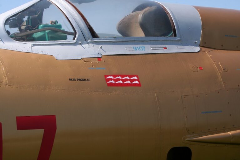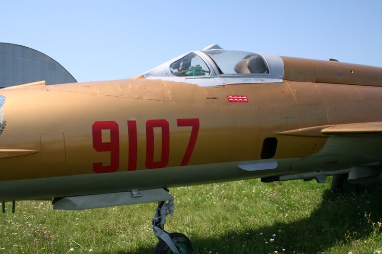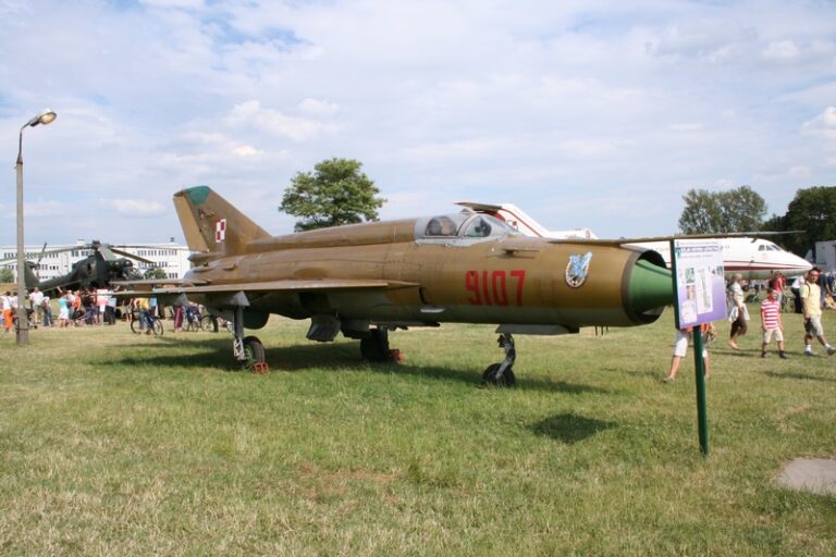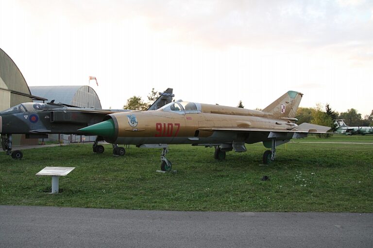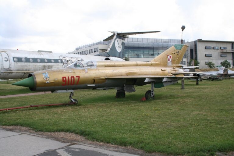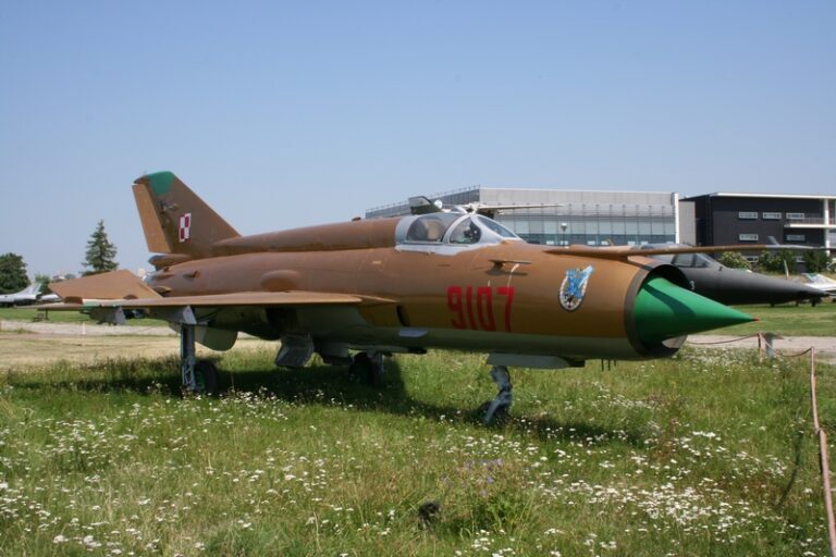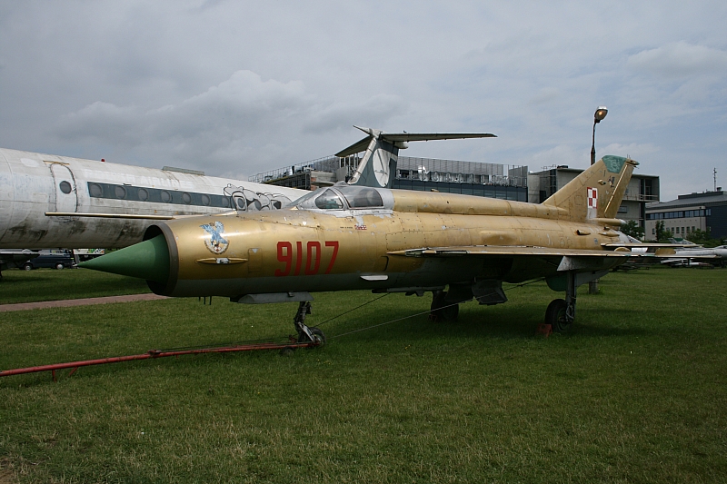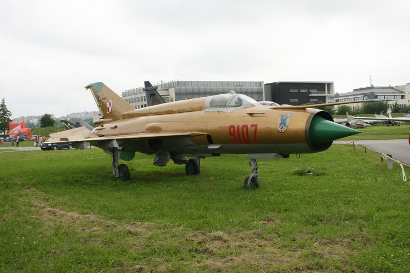MiG-21MF nr fabryczny 969107 n/b „9107” został wyprodukowany w 1974 roku. O jego służbie pod znakiem „Biało-czerwonej Szachownicy” napisaliśmy w artykule „Złoty 9107”. W 2007 roku płatowiec został eksponatem Muzeum Lotnictwa Polskiego w Krakowie znajdującego się na terenie dawnego lotniska Rakowice-Czyżyny, na terenie którego bazował w latach 1946-1963 2.PLM (10.plm). W galerii poniżej prezentujemy samolot „9107” po przeprowadzce do MLP (czerwiec 2007):