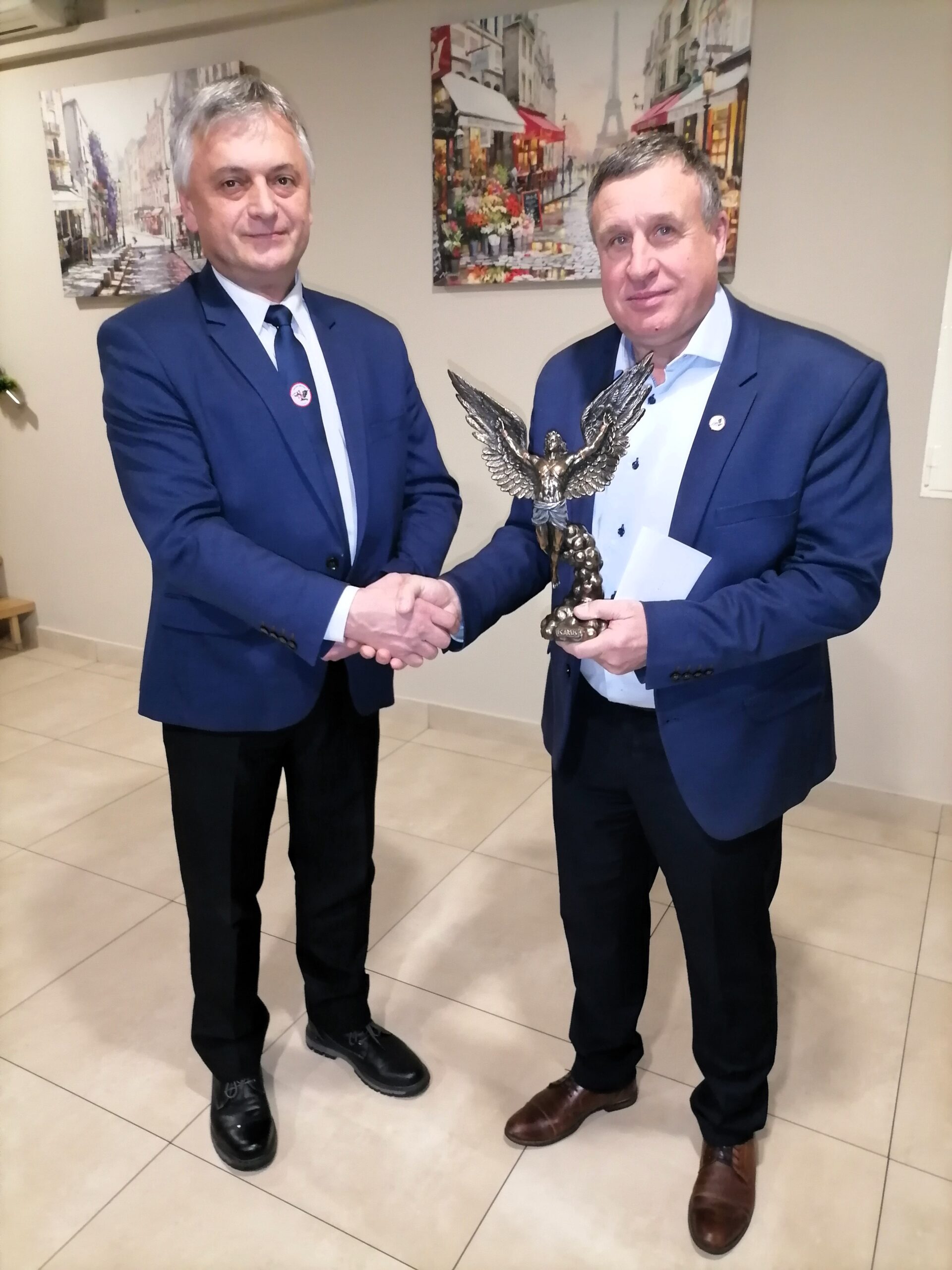W końcu udało się to zrobić podczas spotkania opłatkowego członków Stowarzyszenia Entuzjastów Lotnictwa „Grupa Archeo Łask” 9.12.2023 r. W imieniu całej społeczności szkolnej za wieloletnią współpracę podziękował nauczyciel p. Andrzej Oset, który jest członkiem stowarzyszenia. Na ręce p. Piotra Polita przekazał statuetkę Ikara. Były prezes bardzo się wzruszył i podziękował wszystkim za tak zaszczytne wyróżnienie.